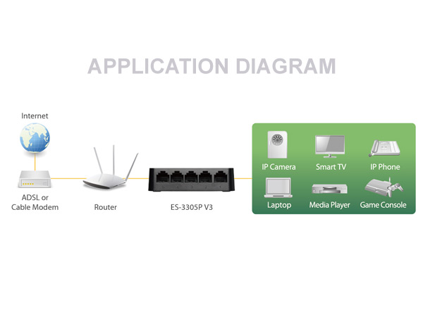 To extend home networks or meet streaming, multimedia transfer, and online gaming requirements the ES-3305P V3 is a cost-effective Fast Ethernet solution. The plug-and-play design ensures users can easily connect network devices such as PCs, network-attached storage, or print servers to a home network with no manual configuration necessary.