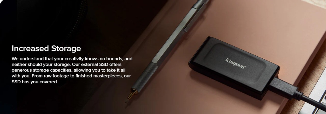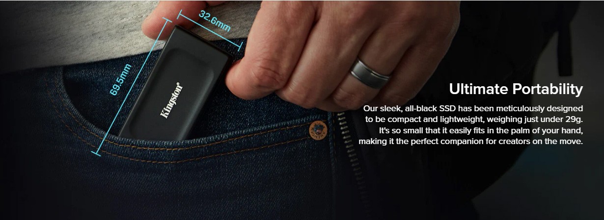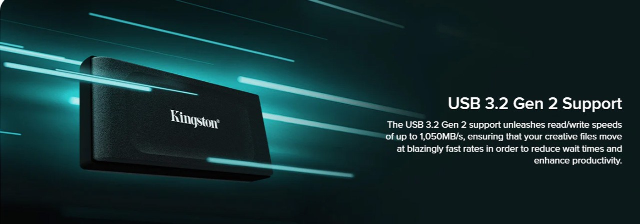 Kingston’s XS1000 external SSD is an incredibly convenient file backup solution. Its sleek, compact form factor is designed to fit seamlessly into your lifestyle, allowing you to carry it anywhere with ease. Don't let its size fool you – this tiny powerhouse boasts speeds up to 1,050MB/s1 and high capacities up to 2TB2, providing ample speed and space to store your valuable data. With its unrivaled convenience and impressive storage capabilities, the XS1000 is your reliable companion for hassle-free file backup, ensuring your important documents, cherished memories, and media files are always readily accessible. Say goodbye to bulk and hello to streamlined storage efficiency with the XS1000 External SSD.