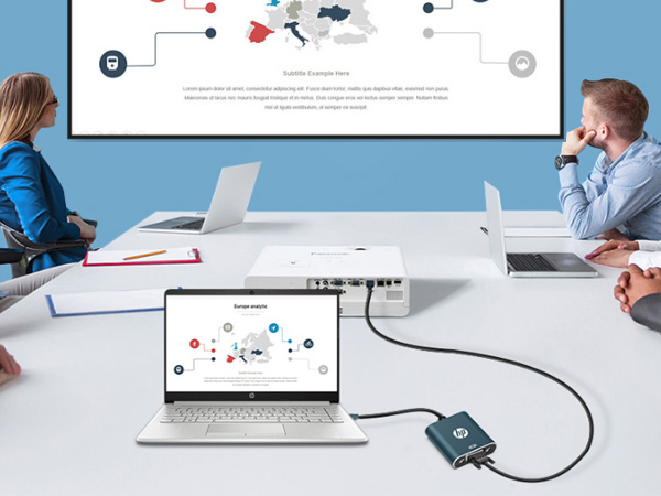 Connect hp video converter to notebook/laptop/desktop pc etc., or to a projector. The computer screen is synchronized with the large screen and the office voice is more efficient.