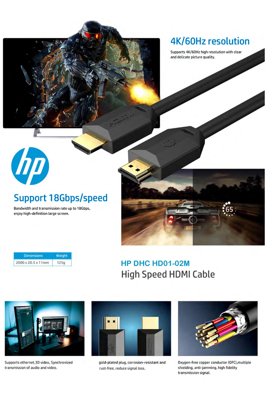 Delivering clear, vibrant video, the HP High-Speed HDMI Cable with Ethernet meets the newest standards, which suggests bandwidth up to 18 Gbps.