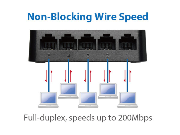 Forwards and receives traffic seamlessly - each port supports speeds up to 200Mbps in full-duplex mode simultaneously, providing full wire speed to connected devices and allowing you to run a high-speed network smoothly.